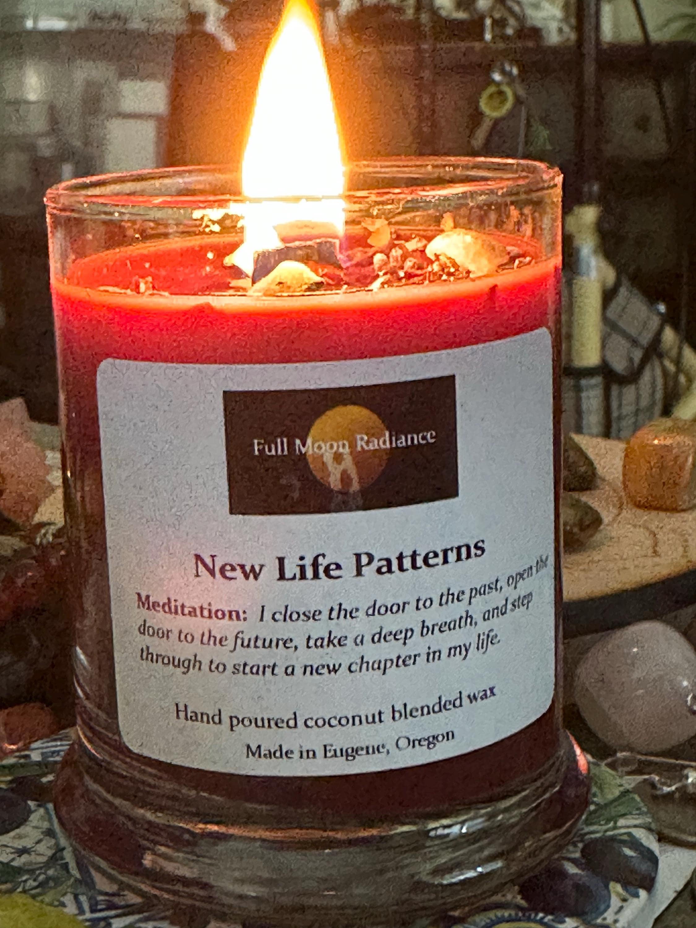 Overall description. Coconut/Apricot wax candle hand-poured into an 8-ounce glass container. Burn time 20 hours. Each candle is devoted to healing the mind, heart, and soul. Handcrafted in Eugene, Oregon, candles have a wooden wick and are offered scented or unscented. Each candle is hand-mixed and hand-poured with love and care, incorporating principles of Wicca, aromatherapy, crystal energy, and color magic. As with all handcrafted products, slight variations in appearance may occur from the candle pictured.